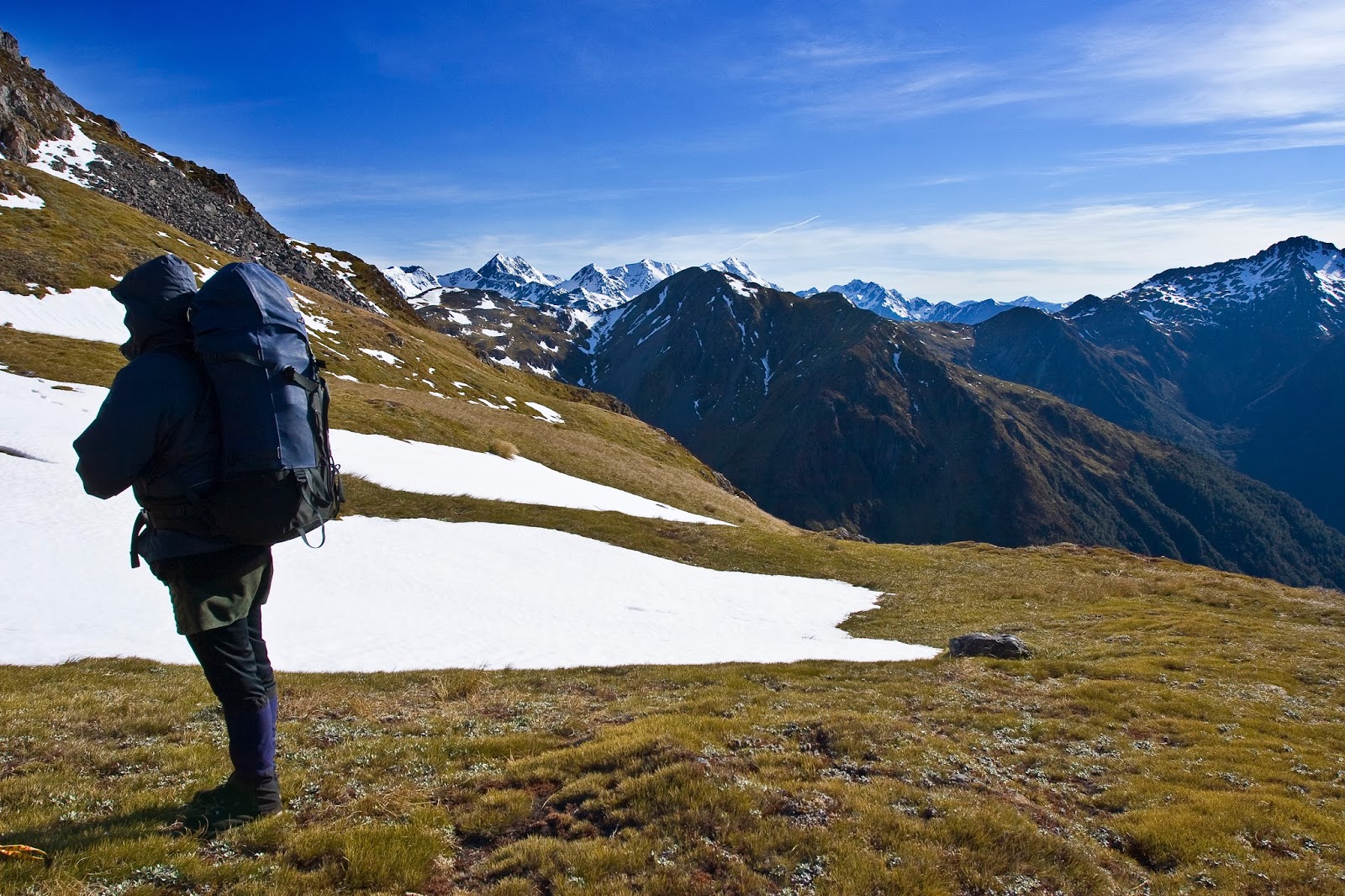 Time, and a cool wind, moved us on. We angled upwards and across to the right, aiming for the nearby saddle. A strong animal trail led us over to the saddle, on a level sidle at around the 1490m contour. In just a few minutes we were there, standing looking down into the opposite valley. The view was stunning - in a moment we were taken from grassy terraces to the mountain grandeur of the snow-capped Spensers.